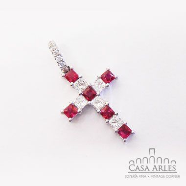 Dije de oro blanco de cruz e incrustaciones